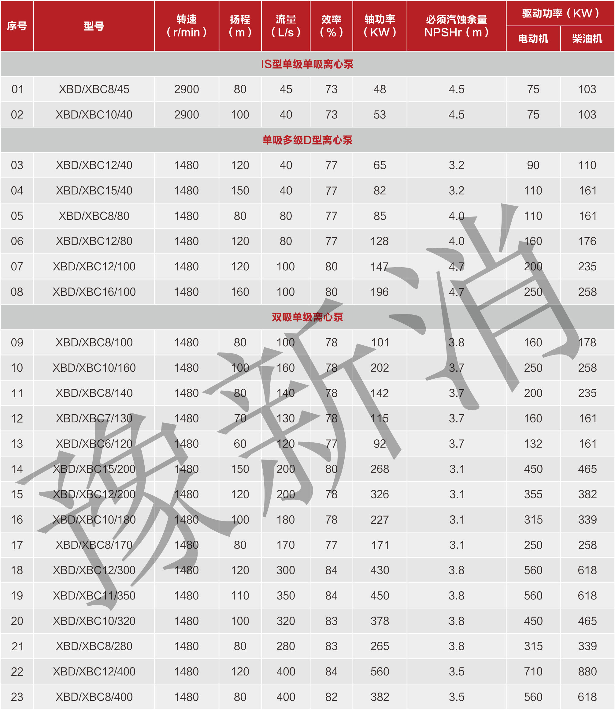 XBD系列電動(dòng)機(jī)消防泵組/XBC系列柴油機(jī)消防泵組性能參數(shù)表